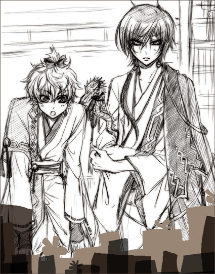 十六號同人活動の情報&萌え話ブログです。PAGE | 283 282 281 280 279 278 277 276 275 274 273 | ADMIN | WRITE 2009.12.04 Fri 15:52:34 ルル誕前祝い★ス:「わー。ルルーシュ凄いね。これ全部キミへの誕生日プレゼントだよ?」 ル;「毎年毎年…、気を遣わなくていいと言っているのに…(特に親族) ……ところでスザク。」 ス;「うん?(ワクワク)」 ル;「その頭については突っ込まないからな。」 ス;「Σえーーーっ!なんで!? キミが『そのリボンどうしたんだ?』って聞いてきたら 『もちろん(僕が)キミへの誕生日プレゼントだよ☆』って言う流れだったのに~っ!ちぇっ」 ル;「………」 昨日今日と原稿頑張ったら何とかなりそうだったので、ルル誕の前祝いをしに来ました! DVD‐BOXの衣装です。 この衣装見てたら、和風(アジア)ファンタジーパラレルもいいなぁ~と思いました。 ルルは冬生まれなので冬の眷属神。スザクは夏生まれだから夏の眷属神。 お互いの季節には眠りに就くので会話したことないけど偶然寝顔を見て惹かれていく…とか。 あー……マンガにすると超・地味展開になるな……。独り言で話が進むという。 もしくはロミジュリ(敵対)設定か……。 それか、中国六官の官職にするとか。 スザクが夏官(軍事)でルルが冬官(皇室の事務・土木工)という設定でもいいかも…。(ぐるぐる) …と言う事を考えながら描いてみました。 アジアンファンタジーは大好きなんですけど…イラストはともかくマンガにすると 背景も衣装も半端なく面倒くさくなるんで辞めとく。。。(正直) 2月の新刊は今まで描いた話の続編かこうかな…とぼんやり考えてます。 プチオンリーもあるから狼男×吸血鬼(ケモミミ)か騎士皇子(年の差)か家庭教師(年の差)か。。。 迷う。うーん…。 明日はイベントですね!そわそわ… ルルにスザクに会える~っ PR Comments無題Posted by nono 2009/12/04(Fri) 19:12:36 EDIT ルル様は、スザク君のリボンは敢えてのスルーなんですね(笑) スザク、可愛いですwww