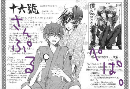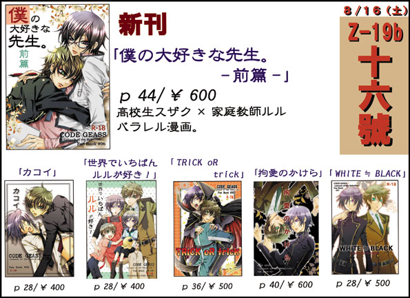 十六號同人活動の情報&萌え話ブログです。PAGE | 71 72 73 74 75 76 77 78 79 80 81 | ADMIN | WRITE 2008.08.15 Fri 23:11:02 ペーパー2008.08.12 Tue 20:31:49 夏コミ情報。夏コミ用お品書き。 夏コミまで、多分お仕事なので、今の内に情報上げておきます。 8月16日(土) スペース: 東2ホール Z-19b 『十六號』 *その他* ・「カコイ」は午前中で無くなるかもしれません。 お求めの方はお早めにお願い致します。 ・「WHITE≒BLACK」も今回で無くなる感じです。 ・ウチの発行物は「拘愛のかけら」以外は18禁ですので 場合によって年齢確認させて頂く事があります。 ご来場される方々へお知らせ⇊⇊ コミックマーケット準備会からの緊急のお知らせ 何事もなく、無事に開催できますように! 生きて帰れますように! 楽しいイベントになりますように! それでは、当日お越しになられる方は気をつけておいで下さいませ。 2008.08.11 Mon 01:26:04 ギアス 18話あの……私……リアルに落ち込んでます。 ナナちゃーーーんんっ!!!!!! キミは死んじゃダメだよ……!! ナナリーのためと思って挑んだ決戦で、 スザクの為にかけたギアスが発動する… 何て、皮肉! 何て、悲劇。 善意が全て裏目に出ちゃったんですね……。 落ち込みすぎて、今回2回目が見直せません…(/_;) 実はC.Cと同族で死んでませんでした!とか 仲間を108人揃えれば、生き返ります!とか そういうオチは無いんですかね??? ルルが、スザクが可哀そう過ぎるよ!!!!! ギアスは、「この人は絶対死なないだろう…」というキャラを 平気で殺すから、油断できない!! そして、今回もう一つの落ち込み原因。 ルルが…ルルが……スザクに対して。 「殺せ!!!!スザクを…!!」 って言った! ショック!!!! そこまで?そこまで嫌っちゃったの? 可愛さ余って憎さ百倍なんだろうな…と思えば、 正直、大いに萌えるんですが、 やはり、基本、スザクとルルには仲よくしてもらいたいので このセリフ聞いて、どーーーんと落ち込みました。 「自分が原因でこの戦いを始めたとしたら…」 「自惚れるな…!!」 ってやりとりは、オイシかったのにな~~。 後は、サヨコさんとか朝比奈とかギルさんとか 結構重要サブキャラが一気に消えて…… 驚愕してます。 これは…最終回全滅も有り得る…。 そして誰もいなくなる…(-_-;) 続きが見たいけど、怖い…っ!! 1期のラストを思い出します。 そうだよ。ギアスってそういうアニメだったよ…。 来週はDVルルたんと、ロロの動向に注目だね! 2008.08.09 Sat 21:29:07 通販開始!