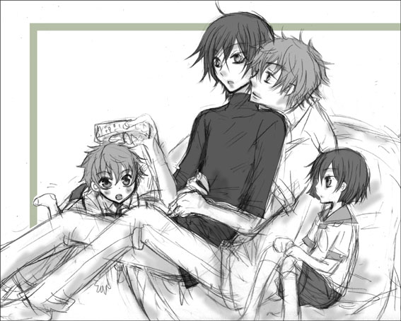 十六號同人活動の情報&萌え話ブログです。PAGE | 83 84 85 86 87 88 89 90 91 92 93 | ADMIN | WRITE 2008.03.30 Sun 10:03:09 枢木家のリビング風景冬コミに出した「世界でいちばんルル(ママ)が好き」で描いた パラレル設定の枢木家の人々。 みんなでテレビ観てる所です。(日常) スザクが夫で、ルルが嫁。 双子の兄弟が生まれて スザク似が「Jr.」 ルル似は「小ルル」という名前です。(安易) そして、次にブログに上げる漫画を考えたのですが、 「世界でいちばん~」の4コマ番外編描こうと思います。 本当は2月の全国大会にコピー本として出そうと思っていたのですが 間に合わず。。。 そうこうしてるうちに、「世界で~」の在庫がなくなったので 本を出す機会が無くなったという…。 また、ボチボチアップして行きますね。 R2放送まで、あと1週間…!!!!!!!!!!!! PR 2008.03.27 Thu 14:07:32 スパコミ新刊スパコミの新刊作業をそろそろ始めなくてはいけないのですが、