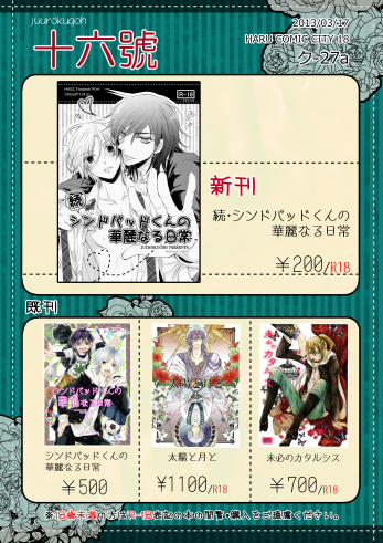十六號同人活動の情報&萌え話ブログです。PAGE | 2 3 4 5 6 7 8 9 10 11 12 | ADMIN | WRITE 2013.05.05 Sun 02:10:06 Rin・Rin・Rin表紙完成6/30開催のマギオンリーイベント「迷宮探訪」の新刊表紙です。 『Rin・Rin・Rin』 p34/¥500の予定。 社長シンドバッド×人型携帯電話ジャーファルの話です。 またアホなパラレル本です。 長編の話は夏コミで頑張りたいと思います。 とりあえずこれから本文がんばるぞー! 6月はまたお仕事あるので5月中には終わらせたい所存です。 あとスパコミお疲れさまでした! スペースまで来て下さった方ありがとうございました! 新刊ないのにお声かけ頂けたり、差し入れしてくださったり本当ありがとうございます。 「今日の新刊は……?」と訊かれるたびに クズですみません。と心の中で土下座してました。 本当すみません。ありがとうございます。 イベント中はスケブをずーーーっと描いてたのですが やたらと戦うジャーファルさん描いてた気がします。 ギアスのスザクやルル―シュとかもリクエストあって嬉しかったです。 たまにスケブ描くと楽しいですね! PR 2013.05.01 Wed 01:39:33 スパコミ5/3 スパコミ スペースは 東4ホール き-30a 「十六號」です。 今回……新刊落しましたぁーーーー\(^o^)/ すみません。本当すみません。 次の新刊は6月の迷宮探訪で出したいと思います。すみません。 なのでスパコミではスケブ受け付けたいと思います。 ご希望の方はお声かけ下さい。よろしくお願いいたします。 その他注意事項はいつもの通りです。(下の記事にあるのと一緒です) あと、5/5に開催されるCOMITIA104で 白泉社時代の同期の方たちが合同本を出すそうです。 それで私もちょっとだけ参加させて頂くことになりました。 童話モチーフの 短編漫画&イラスト集です。 詳細はこちらから→→ 特設HP 執筆者が全員商業作家というだけあってクオリティは間違いないと思います。 虎の穴さんで通販もあるそうです。 私は牛若丸描かせて頂きました。 少女マンガ家達の中で空気も読まずに趣味に走ったよね……。 でも楽しかった満足! ![]() 興味を持たれた方はよろしくお願いいたします。 2013.03.15 Fri 10:20:32 ハルコミ!3/17 ハルコミのお品書きです。 スペース 東1ホール ク-27a 「十六號」 でお待ちしております。 **注意事項** ●当サークルの配布物は18禁の本を含みます。 18歳未満の方はR-18表記の本の閲覧・購入をご遠慮ください。 R18表記の発行物のご購入を希望する方を対象に年齢確認をさせて頂く場合があります。 必ず年齢が確認できる身分証明書(運転免許証・保険証・学生証・taspo等)をご持参ください。 身分証明をお忘れの方は成人向け発行物をご購入いただけませんので、お忘れのない様ご注意ください。 ●イベント開場直後は、できるだけ高額紙幣はご遠慮下さい。 釣銭間違いの原因になるため50円10円硬貨のご使用はできるだけご遠慮ください。 ●本の取り置きはしていません。 ●スケブの受け付けはしていません。 ●今回1人での参加なのでイベント開始直後に席を離れている可能性があります。すみません。 あと何かご質問等ありましたらメール・コメント・ツイッター等でお願いいたします。 2013.03.01 Fri 17:12:06 脱稿\(^o^)/無事に脱稿しました! これで春コミに新刊あります! 『続・シンドバッドくんの華麗なる日常』 p16/¥200 R18 前に出した「シンドバッドくんの華麗なる日常」で描き切れなかった いちゃラブパートです。 一応サンプルです。(R-18) 通販は虎の穴さんにお願いしてます。 予約はじまりました→http://bit.ly/XgwlCG 3/17 ハルコミスペースは 東1ホール ク-27a 「十六號」です お品書き等詳細はイベント直前に上げます。 2013.02.12 Tue 04:10:28 千夜一夜お疲れさまでした!大変おそくなりましたが、先日の千夜一夜お疲れさまでした!