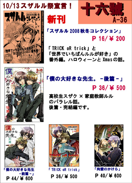 十六號同人活動の情報&萌え話ブログです。PAGE | 65 66 67 68 69 70 71 72 73 74 75 | ADMIN | WRITE 2008.10.07 Tue 20:03:26 スザルル祭お品書きスザルル祭のお品書きです。 新刊の「スザルル2008秋冬コレクション」は無事に入稿できました! 何の問題もなければ、当日スペースに並んでると思います! 新刊は一応、十分な量を搬入したつもりです。(一応…) 「僕の大好きな先生-前篇-」 「TRICK oR trick」 「拘愛のかけら」 をお求めの方は、在庫が残り僅かですので、お早めにお求め下さいませ。 その他の注意事項 ・当サークルの発行物は18禁表示のものを含みます。 R18本は18歳未満の方の閲覧、購入はお断りさせて頂きます。 「僕の大好きな先生」「TRICK oR trick」は18禁です。 ・それに伴い、年齢確認をさせて頂く場合があります。 大変恐縮ですが、ご協力をお願いいたします。 ・スケブの件ですが、今回は売り子さんを連れていくので、 前回のような混雑はないと思いますが、一応午後からの受付にさせて下さい。 リクエストは一人にして頂けると有り難いです! ・差し入れとお手紙の件ですが、いつも有難うございます!! 何もお礼ができないのがとても心苦しいので、もし宜しければ、 お手紙等に住所・氏名をご明記頂けないでしょうか? 不都合がなければ年賀状を送らせていただきます。 (教えて頂いた、個人情報は年賀状の企画のみに使わせていただきます。 使用後は、きちんと破棄致します) イラスト入り年賀状の予定なので ご家族公認の方に限りますが、 よろしければお願致します! 過去にお手紙、差し入れ下さった方もメール等で連絡頂ければ、年賀状を送らせていただきます。 (12月15日までにお知らせくださいませ) メール; toroku_16★yahoo.co.jp (★→@に変えて下さい) 宜しくお願い致します。 PR 2008.10.06 Mon 21:07:35 帰宅~今日まで泊まりのお仕事に行って参りました。 さすがに疲れました。 仕事先の先生がギアスのちびボイス人形をくれました! やったーーー☆ スザクくんが「イエス・ユア・マジェスティ」…って言うよ!! ロロが「僕がもらったんんだ!だから僕のなんだ!」…って携帯握りしめてるよ! かわいい…っ! そういえば、仕事先でご飯食べてる時にに水嶋ヒロさんがTVに出てたのですが 先生 「水嶋ヒロって、細いくせに筋肉ちゃんと付いてて、良い体してるよね」 私 「髪の毛もクルクルしてて可愛いですよね…!」 二人 「……………。」 私 「…実写版のスザクは、水嶋ヒロでいいんじゃないですか?」 先生 「!!!!! ホントだ!スザクだ…!!!!」 …と大いに盛り上がっていました。 私と先生の間では、水嶋ヒロさんは、スザクです。 2008.10.02 Thu 14:33:02 まずい…です。今日中に原稿終わらすつもりが…… 色々まずい…。 *****新刊情報******* 『スザルル2008秋冬コレクション』 P16/¥200 ハロウィーンとXmasネタ本です。 久しぶりに18禁じゃありません。(こんな絵上げてますが…) エロがなきゃ同人じゃない!!という方。すみません(-_-;) 一応ラブラブなかんじで。 あと、近頃よく「僕の大好きな先生」についてのお問い合わせをいただくので (ありがとうございます!) 他の本を含め、改めて在庫状況等、報告しておこうと思います。 *在庫あり……スザルル祭に持って行きますが、通販の予定は無し。 ・『僕の大好きな先生-後篇-』 在庫あり。 ・『僕の大好きな先生-前篇-』 残少。 ・『TRICK oR trick』 残少。 ・『拘愛のかけら』 残少。 *完売本 ・『カコイ』 ・『世界でいちばんルルが好き!』 ・『WHITE≒BLACK』 **************************************** こんな感じです。 お品書き、ペーペー絵等は、スザルル祭近くなったら上げます。 完売本・残少本の再録・再版は検討中です。 スザルル祭後に在庫状況等検討して報告いたします。 宜しくお願い致します<(_ _)> 2008.09.30 Tue 18:43:03 スザルル祭用 新刊表紙悲しみも冷めやらぬまま、スザルル祭用新刊の作業中です。 新刊の『スザルル2008秋冬コレクション』表紙! これ、他ジャンルで活動中の友達が加工してくれました!! 当初、スザルル祭に新刊の予定はなかったのですが、 友達が 「オンリーで新刊出さないとダメだよ!!寂しいよ!!??」 …と力説するので、 …じゃあ、薄い本でも出そうかな…という気になり でもな~時間ないしな… 表紙は最悪文字だけでいいか……と言ってたら 「そんなのダメ!!!今、絵描いて!そしたら、私が加工してあげるから!!」 と申し出てくれたので、仕事の合間を見つけて、線画だけ速攻で描いて 友達に丸投げしました。 そしたら、あら不思議。あっという間に表紙が上がって来ました!! わーーー~~っ!!!! 雑誌風ですね!素敵、素敵☆☆ 私じゃ絶対に出来ない細かい仕上がりです~。 あとは、本文だけ…なんですが…… まだ下書き…デス☆ ルルを描くのが辛い……。ううっ。 あ、虎の穴さんにお願いしていた『僕の大好きな先生-後篇-』は 昨日あたりに通販終了していたみたいです。 ご利用くださった方、有難うございました! 2008.09.29 Mon 18:36:12 ギアス 25話全然落ち着いてないんですけど、 